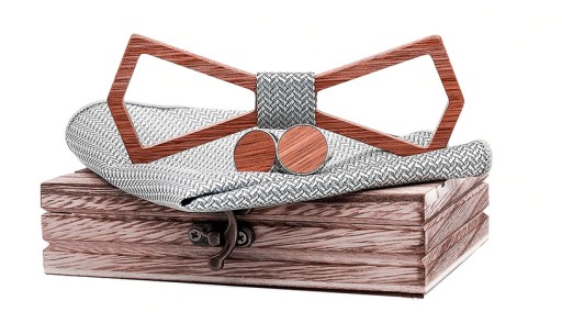 Elegancka drewniana mucha w ciekawym kształcie z szarym/srebrnym akcentem. W zestawie jest również poszetka w kolorze szarym/srebrnym oraz spinki do mankietów drewniano stalowe z wzorkiem. Całość zapakowana jest w eleganckie drewniane opakowanie.