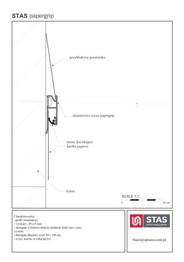 Dzięki unikatowej konstrukcji listwa STAS Papergrip ma dwa zastosowania. Kartki papieru, małe plakaty czy zdjęcia można wsunąć krawędzią do środka listwy, a sprężynująca taśma zablokuje je przed wypadnięciem. Prace łatwo wyjmiemy przez lekkie pociągnięcie do dołu. Z kolei górna krawędź listwy posiada specjalny rowek, dzięki któremu można postawić na niej sztywniejsze prace: kartki, zdjęcia, pocztówki itp.