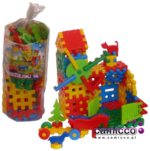KOPARKA z ruchomymi elementami, TOR WYŚCIGOWY z autkami, PLATFORMY do budowania, SAMOLOT, MŁYN, SZCZĘŚLIWA RODZINKA,