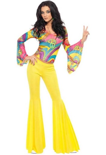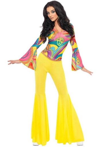 Strój Disco dla dorosłych Przebranie Hipiski Kostium Lata 70. Ten kolorowy kostium sprawdzi się doskonale podczas imprezy o tematyce hipisów, a nawet jako szalona letnia kreacja idealna na imprezę na plaży. Niech wszystkich olśnią Twoje słoneczne spodnie, a kolorowa koszula wzbudzi zachwyt u przyjaciół.