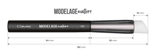 Pędzel o bardzo oryginalnym kształcie, jakiego prawdopodobnie nie ma w swojej ofercie żadna inna polska firma. Unikalny, a jednak tak bazowy przy makijażu profesjonalnym, bo “Modelage metters!”. Pędzel zaprojektowano do perfekcyjnego konturowania na mokro. Płaska powierzchnia i zbita struktura pędzla sprawiają, że jest on idealny do produktów mokrych, jednocześnie elastycznie pracując ze skórą. Jego ścięta główka o niewielkim rozmiarze pozwala dokładnie rozprowadzić produkt na wybranych partiach twarzy. Można pracować nim używając całej powierzchni włosia lub jedynie precyzyjnej, ściętej krawędzi.