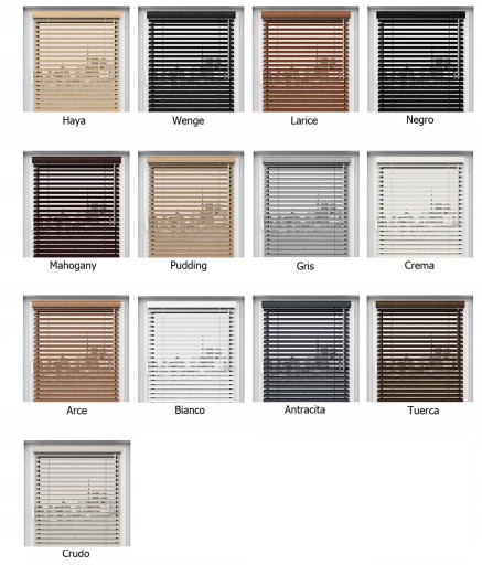 Drewniane lamele wykonane są z azjatyckiego drewna typu Basswood o szerokości 25mm. Charakteryzują się one wysoką odpornością na wilgoć oraz na zmiany temperatury. Żaluzje drewniane możemy wykonać aż do szerokości 240 cm. Szeroka gama kolorów drewna zapewnia swobodę wyboru i dopasowania żaluzji do wystroju wnętrza oraz stolarki okiennej. Dodatkowo, dbając o jakość naszych wyrobów wszystkie elementy składowe żaluzji dobierane są w kolorach najbardziej zbliżonych do kolorów lameli. Boki Lameli: Mahogany, Wenge, Negro, Antracita oraz Tuerca malowane są bejcami najbardziej zbliżonym do ich kolorów. Boki pozostałych lameli nie są bejcowane.