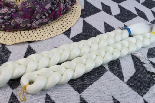 Włosy syntetyczne w przepięknym wariancie kolorystycznym - białym (ecru). Wykonane z gładkiego i przyjemnego w dotyku henlonu. Model świecący w ciemności.