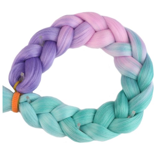 Włosy syntetyczne w przepięknym wariancie kolorystycznym - fioletowo-różowo-turkusowym. Wykonane z gładkiego i przyjemnego w dotyku henlonu.