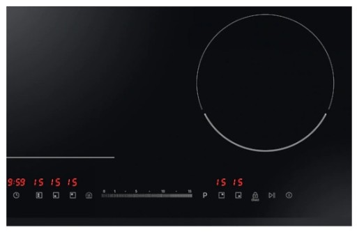 Strefa Flex Zone posiada moc 3,0 kW (booster zwiększa ją do 4,0 kW), 2 pola grzejne o średnicy 180 mm mają moc 1,8 kW (booster 3,0 kW).