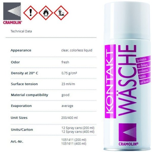 Zastosowanie: Do intensywnego czyszczenia i odtłuszczania części i komponentów elektronicznych oraz komponentów i urządzeń inżynierii elektrycznej, takich jak: złącza elektryczne, styczniki, przełączniki, styki w gniazdach i wtyczkach, silniki elektryczne, przekaźniki, szafki rozdzielcze itp. Rozpuszcza i czyści zabrudzenia nie wchodząc w reakcje z materiałami używanymi w elektronice. Do stosowania po użyciu środka CONTACLEAN.