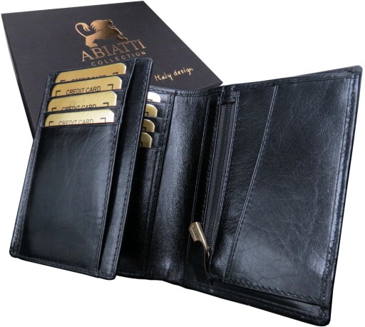 Portfel jest zapakowany w oryginalne, eleganckie pudełko ze złotym logo, od wewnątrz wyłożone eleganckim materiałem ABIATTI.