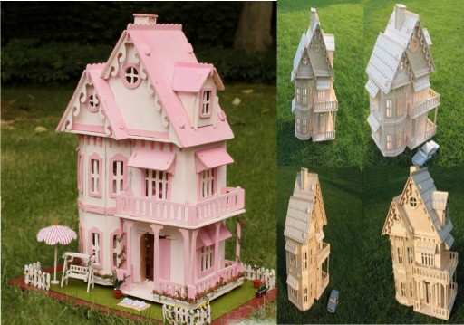 Mebelki wykonane są ze sklejki drewnianej. Powycinane elementy wyciskamy z szablonu ,dopasowujemy i łączymy z sobą na wcisk według załączonej instrukcji obrazkowej.Do zestawu dołączony jest papierek ścierny którego można użyć w razie potrzeby aby lepiej i precyzyjniej dopasować poszczególne elementy z sobą.