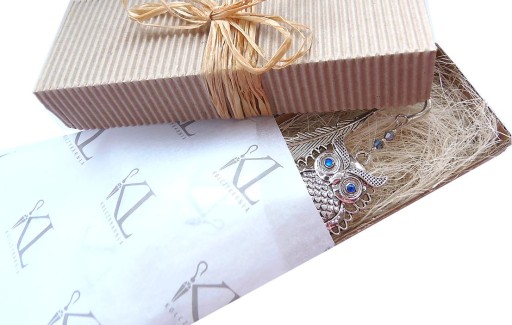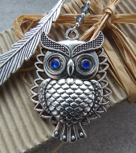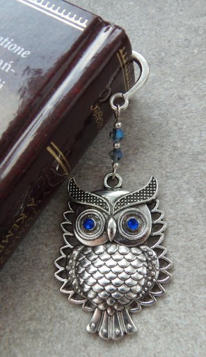 Zakładka ma kształt pióra, którego ozdobą jest piękna, niebieskooka sowa - symbol wiedzy, mądrości, oraz kryształki - bicone 4mm. Zakładka ma długość ok 12cm. Opakowana jest w ładne, klasyczne pudełko prezentowe - utrzymane w naturalnej tonacji piaskowo beżowej. Pudełeczko wypełnione włóknem kokosowym, przewiązane jest rafią. Idealny pomysł na prezent np dla Nauczyciela, dla kogoś bliskiego. Sprawdzi się jako miły drobiazg z okazji urodzin, imienin - zamiast kwiatów, lub jako dodatek do książki, kalendarza, notesu.