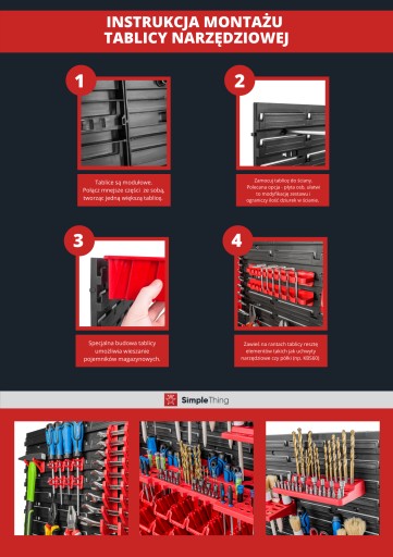Świetny dodatek stanowią wytrzymałe uchwyty i półki narzędziowe pomagające przechowywać dłuższe narzędzia tj. młotek, wiertła, klucze, śrubokręt czy kombinerki. Dzięki uchwytom najważniejsze narzędzia będą zawsze pod ręką i zajmą znacznie mniej miejsca w warsztacie. Praktyczne oraz świetnie wyglądające rozwiązanie.