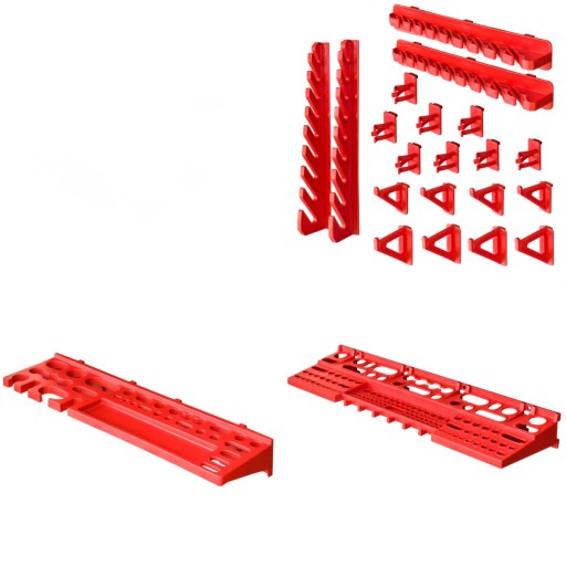 Jednym z najważniejszych elementów zestawu są uchwyty i półki narzędziowe, mocowane do tablicy w poziomie pozwalają na przejrzyste ułożenie wszystkich niezbędnych narzędzi. Niewykorzystana przestrzeń nad blatem roboczym to idealne miejsce na tablicę narzędziową, zapewniające dostęp na wyciągnięcie ręki. Prezentowany zestaw zawiera uchwyty i półki narzędziowe według specyfikacji:
