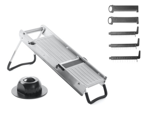 Mandolina posiada składaną antypoślizgową podpórkę oraz polipropylenowy element dociskowy pozwalający na stabilne prowadzenie ciętego warzywa.