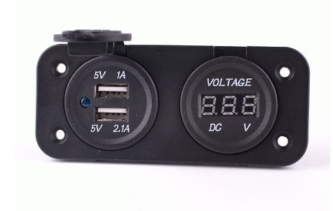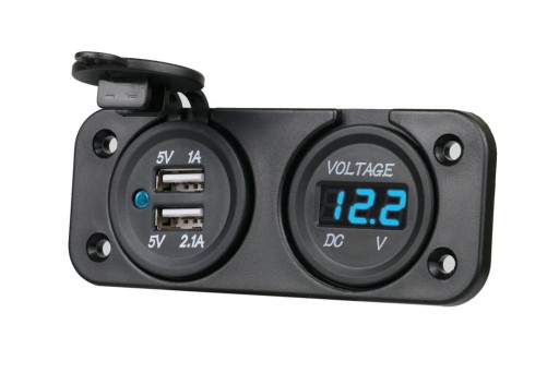 Panel składa się z cyfrowego woltomierza wyświetlającego aktualny poziom napięcia akumulatora i dwóch portów USB szybkiego ładowania o napięciu 5V 3.1A (2.1A + 1A).