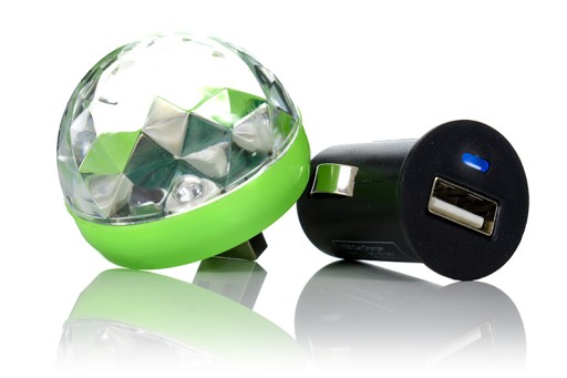 Miniaturowa, przenośna kula dyskotekowa LED ze standardowym wtykiem USB w zestawie z ładowarką samochodową!