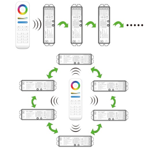 Sterowniki strefowe MiLight umożliwiają stworzenie oświetlenia strefowego dla maksymalnie 8 stref oświetlenia. W każdej strefie możesz zastosować dowolna ilość sterowników. Jeśli parametry taśmy w danej strefie przewyższają parametry sterownika - zastosuj dodatkowy sterownik i przypisz go do tej samej strefy.