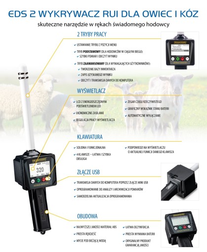 Wykrywacz optymalnego terminu krycia u owiec i kóz Dramiński EDS nowej generacji to doskonałe urządzenie dla hodowców, którzy mają problem z efektywnymi kryciami. Dzięki tej prostej metodzie hodowca ma możliwość rozpoznania zaburzeń cyklu płciowego i wyznaczenia najlepszego terminu do krycia, nawet jeżeli objawy zewnętrze na to nie wskazują (cicha ruja). Aparat wykorzystuje zależność pomiędzy zmianami oporności elektrycznej śluzu pochwowego a występowaniem owulacji. Pomiar jest łatwy do wykonania i całkowicie bezpieczny.