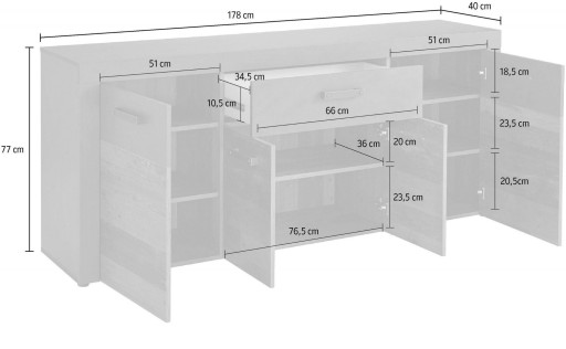 Bryła w stylu rustykalnym, która pochodzi z kolekcji postarzanych mebli Hindon. Komoda została wyposażona w czworo drzwi, za którymi znajduje się pięć praktycznych półek. Powyżej zamontowano pojemną szufladę z frontem w kolorze szarym. Całość zdobią charakterystyczne ciemne uchwyty o staromodnym designie.