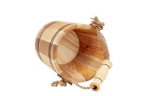 Drewniane wiaderko dokładnie i estetycznie wykonane. Wyposażone w uchwyt z grubego sznura z nawleczonym drewnianym klockiem.