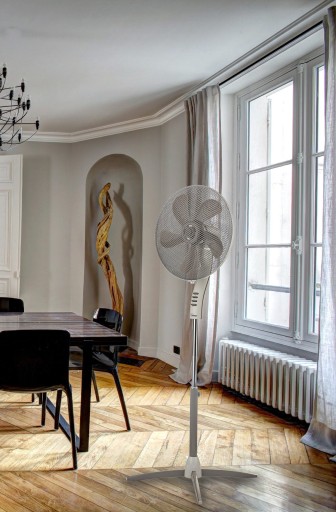 Stojący wentylator w kolorze biało-szarym, z cichym silnikiem indukcyjnym o dużej mocy 55 W.