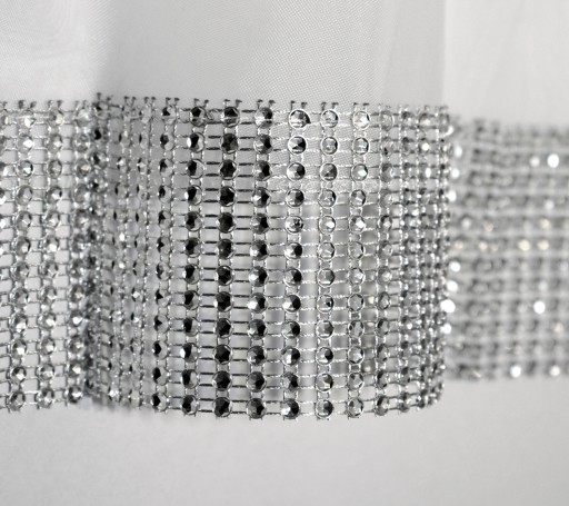 Elegancka FIRANA wykonana z białego woalu. Wykończona u dołu ozdobną taśmą (o szerokości 6 cm) oraz drugą taśmą (o szerokości 3 cm) wszytą na materiale, imitującą pięknie połyskujące kryształki (cyrkonie).