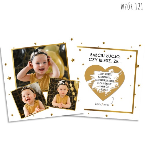 Spersonalizowana kartka ZDRAPKA dla babci i/lub dziadka to oryginalny pomysł na upominek z okazji ich święta lub dodatek do przygotowanego większego prezentu! Na kartce zostaną umieszczone przesłane przez Ciebie zdjęcia, a pod zdrapką ukryty dowolny tekst - może być to wierszyk, sentencja lub życzenia płynące prosto z serca wnuków.