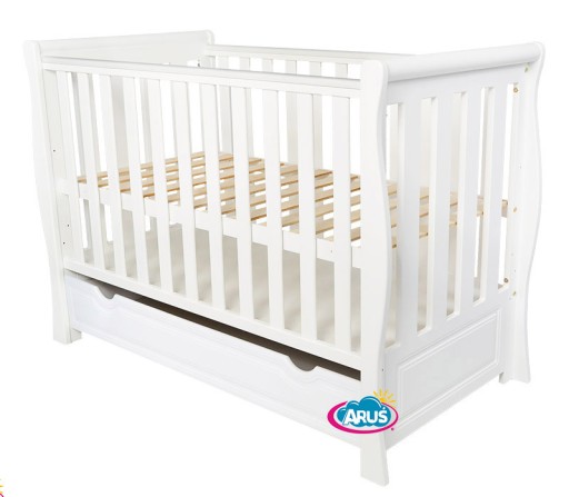 - Stylowe, funkcjonalne łóżeczko z szufladą wykonane z drewna sosnowego oraz płyty