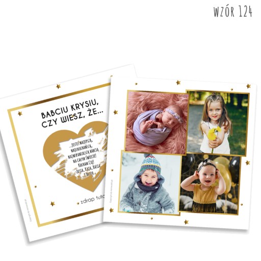 Spersonalizowana kartka ZDRAPKA dla babci i/lub dziadka to oryginalny pomysł na upominek z okazji ich święta lub dodatek do przygotowanego większego prezentu! Na kartce zostaną umieszczone przesłane przez Ciebie zdjęcia, a pod zdrapką ukryty dowolny tekst - może być to wierszyk, sentencja lub życzenia płynące prosto z serca wnuków.