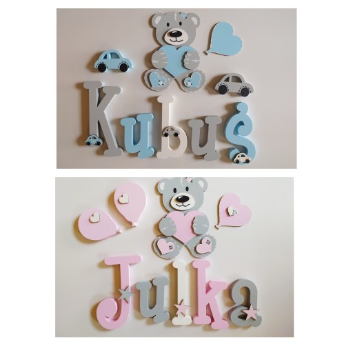 Do każdego zakupionego imienia (co najmniej 3 litery )otrzymujesz dwa duże 10 cm dekory nad napis oraz kilka małych dekorów naklejonych na literki w miejscach nacięć tak jak w poniższych naszych realizacjach w galerii.