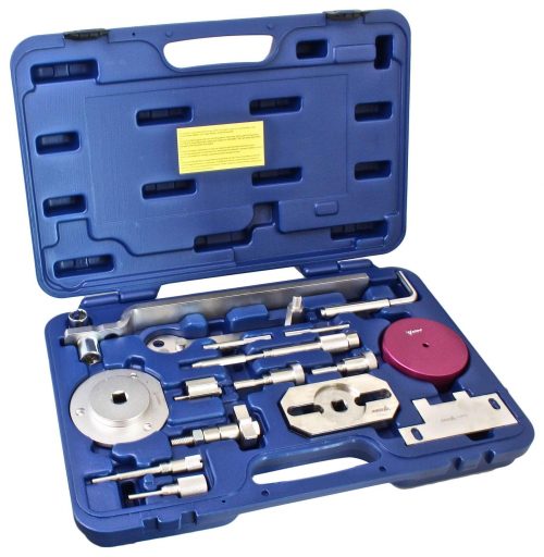 W zestawie znajduje się m.in. klucz do montażu czujnika pompy wody, narzędzie do obracania wału korbowego, płyta centrującą oraz narzędzia blokujące wał korbowy i wałek rozrządu.