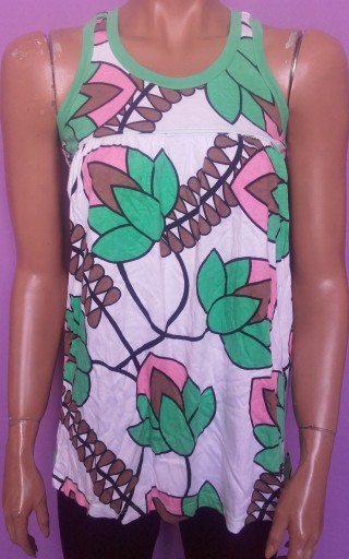 Bluzka damska na ramiączkach ,dół rozkloszowany,wszyta gumka pod biust ok.5cm poniżej pachy,znaczek firmowy u dołu,z tyłu u góry haftowany mały napis firmowy