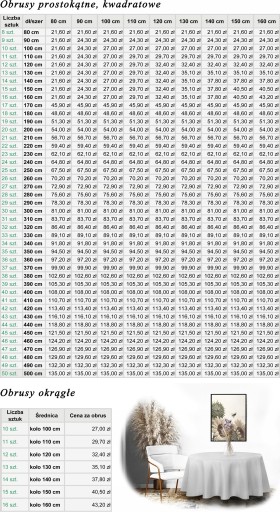 - Jeżeli potrzebujesz obrus o wymiarze 100x130 cm wyszukaj w tabeli podanej poniżej wybrany rozmiar obrusa i sprawdź jego cenę.