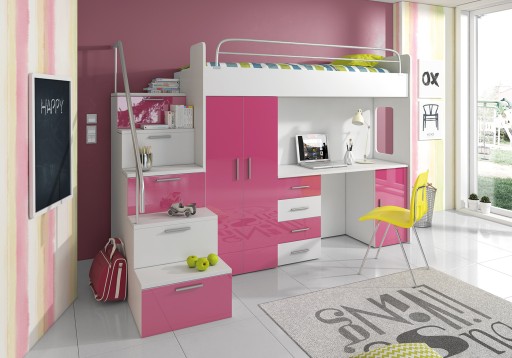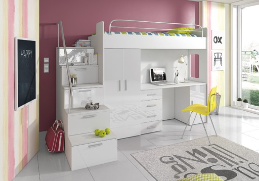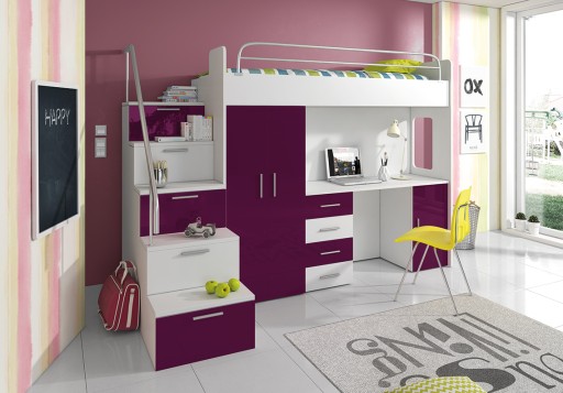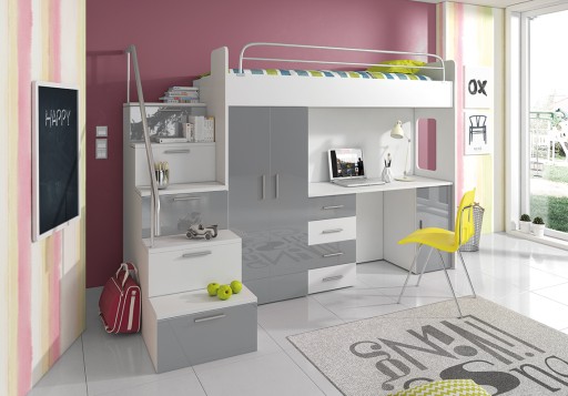 Łóżko cechuję się nowoczesnym wzornictwem oraz precyzyjną jakością wykonania, zapewnia wyjątkowo dobry sen oraz gwarancję bezpieczeństwa i pewność, że Twoje dziecko obudzi się wypoczęte. Fronty zestawu są wykonane z płyty meblowej MDF na wysoki połysk w bogatej kolorystyce, która pozwoli dopasować mebel do każdego pokoju. Górna powierzchnia spania oraz schodki przy łóżku wyposażone są w barierki, chroniące twoje dziecko przed wypadnięciem.