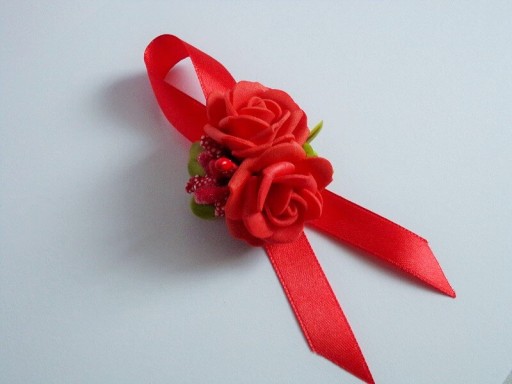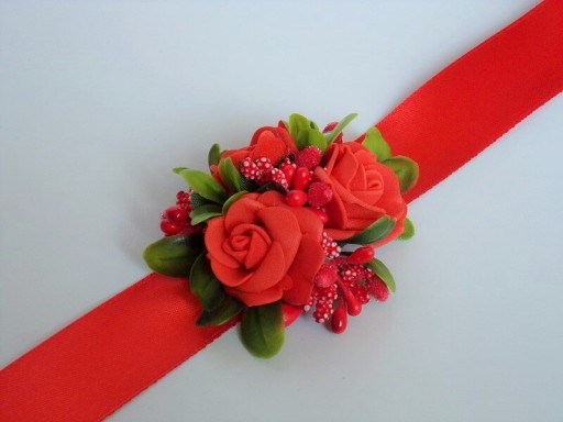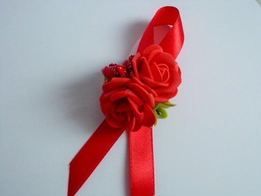Na rękę wiązany jest za pomocą czerwonej satynowej tasiemki o szerokości 25mm i długości ok. 40cm.