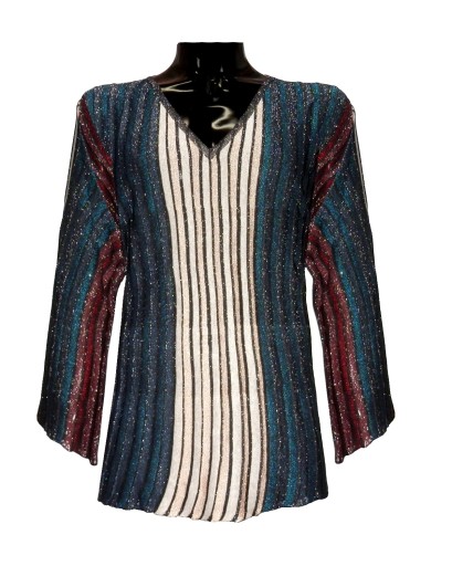 Pulower damski Arazzo, Marina Rinaldi - wykonany we Włoszech, piękny, delikatny sweter damski, o kroju oversize. Materiał "lejący" - doskonale układa się na ciele, pomimo dużych rozmiarów. Rękawy poszerzane. W tkaninę wpleciono metaliczną nitkę. Sweter doskonale sprawdzi się zarówno na co dzień, jak i na specjalne okazje.
