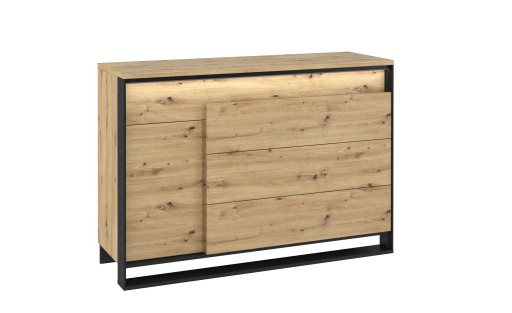 Komodę zaprojektowano w modnym, loftowym stylu. Ciekawy dekor o wyraźnym rysunku drewna znakomicie wygląda w towarzystwie czarnych detali. Trójwymiarowy charakter frontów został dodatkowo podkreślony przez ledowe oświetlenie.