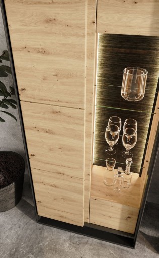 Bryły wyposażono w zewnętrzne ledowe oświetlenie, które podkreśla trójwymiarowy charakter frontów. Wewnętrzne oświetlenie witryn, dostępne w opcji dodatkowej, pozwala ciekawie wyeksponować przedmioty umieszczone za szkłem oraz podkreśla rysunek drewna na plecach mebli.
