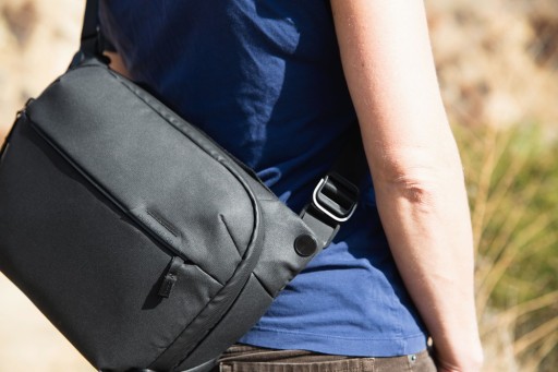 Torba typu sling do noszenia przez ramię i plecy, idealnie dopasowana do transportowania lekkich przedmiotów codziennego użytku i lekkiego sprzętu fotograficznego.
