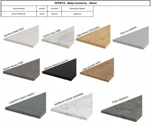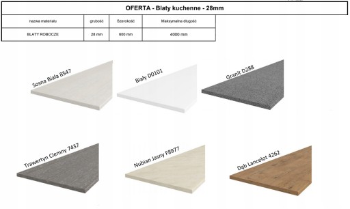 Nasza oferta pozwala Państwu wybrać kolor oraz rozmiar blatu. Posiadamy blaty 28 mm i 38 mm
