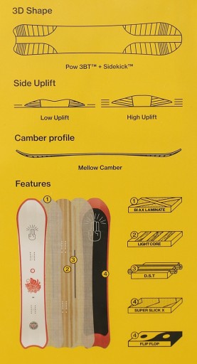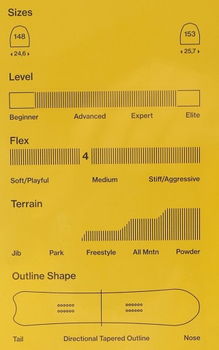 kształt: DIRECTIONAL - klasyczny, najbardziej wszechstronny kształt desek snowboardowych, zaprojektowany z lekko przedłużoną końcówką, aby skoncentrować pop w obszarze pięty, oferując jednocześnie wystarczającą kontrolę i sterowanie w każdym terenie i warunkach; kształt Directional służy do jazdy głównie w jednym kierunku