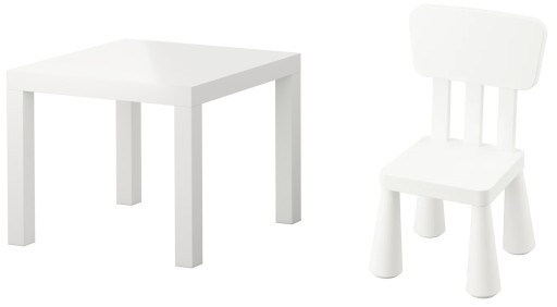 Zestaw IKEA Lack biały stolik o wymiarach 55 cm x 55 cm + krzesełko mammut w kolorze białym.