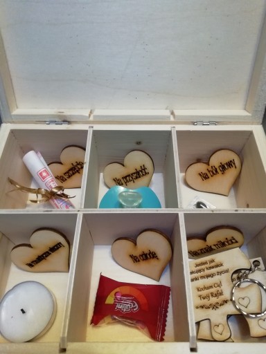 Kupując ten przedmiot otrzymujesz pudełko z grawerem wraz z 6 serduszkami z napisem