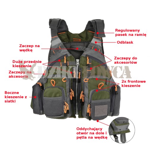 Nowe wygodne kamizelki wędkarskie z dużą ilością kieszeni i zaczepów, rozmiar uniwersalny. Liczne kieszenie pomogą trzymać wszystkie akcesoria razem. Wykonana z wytrzymałego, wodoodpornego, oddychającego materiału. Regulowane paski i pas sprawiają, że nada się dla każdego wędkarza. Wykonany z najwyższej jakości poliestrowej powłoki ripstop. Świetne do łowienia na muchy, spinning dla każdego wędkarza.