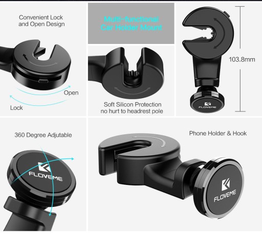 Uchwyt magnetyczny Floveme posiada uniwersalny i łatwy w obsłudze mechanizm mocowania na zagłówek .