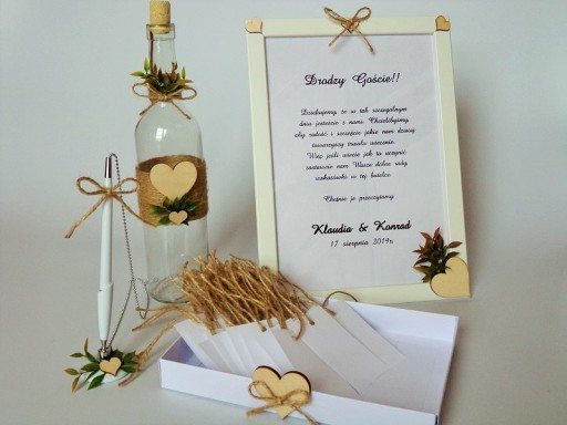 Na pozostałym aukcjach można dokupić wykonane w tym samym stylu inne przedmioty dekoracyjne: wieszaki ślubne, dekoracyjne ramki z inicjałami, ramki z numerami stołów, księgi gości.