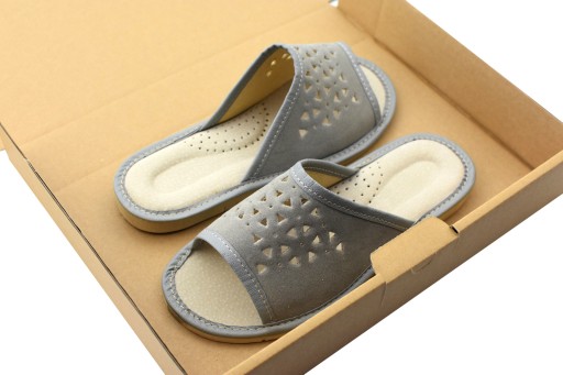 Pantofle są starannie pakowane w pudełka firmowe o różnych wymiarach.