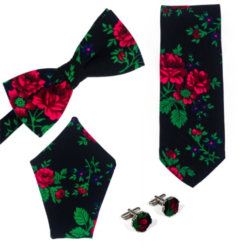 Ta niezwykła poszetka została uszyta z materiału zdobionego charakterystycznym ludowym motywem kwiatowym. Jako wyrazisty dodatek świetnie sprawdzi się w połączeniu ze stonowaną koszulą lub garniturem. Poszetka uszyta jest z najwyższą starannością i dbałością o szczegóły, obszyta delikatną drobną mereżką. Zamiast gorszej jakościowo bawełny, której kolory szybko blakną, poszetka została wykonany z wiskozy o ostrych i wyrazistych kolorach.