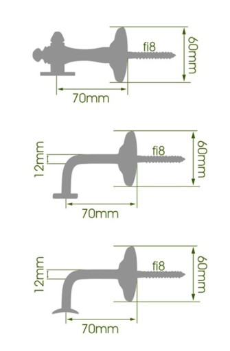 Uchwyty posiadają śrubę mocującą do ściany wraz z kołkiem rozporowym. Śrubę można wykręcić i zamienić na śrubę o innej długości.
