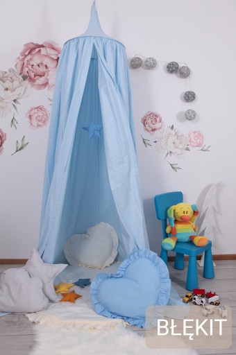 Baldachim to niezwykle efektowna ozdoba pokoju dziecięcego, miejsce do zabawy oraz wypoczynku. Zawieszony nad łóżeczkiem niemowlaka, wytłumi hałas oraz ochroni przed nadmiarem światła później posłuży jako strefa zabawy i wypoczynku w pokoju przedszkolaka. Znakomicie sprawdzi się w niewielkim pokoiku gdyż nie zajmuję wiele miejsca. Wewnątrz szczytu można przymocować dekoracje, ozdobne lampki.