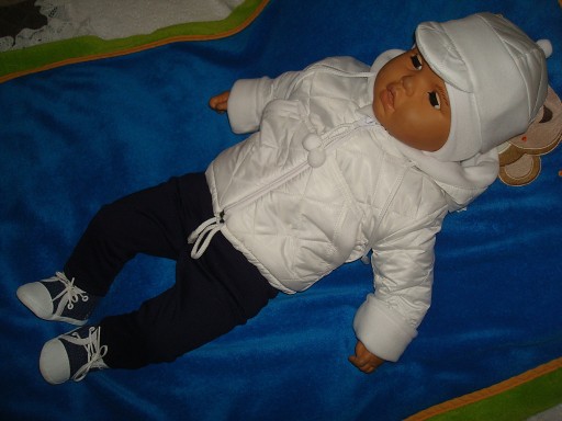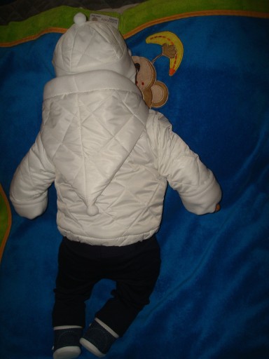 - KURTKA BIAŁA PIKOWANA NA POLARZE W ŚRODKU OCIEPLINA ZIMOWA Z KAPTURKIEM NA DOLE KURTKI ŚCIĄGACZ DZIĘKI CZEMU DZIECKO MA CIEPLUTKO