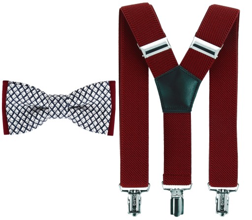 KOLOR: szelki bordo i muszka w granatowo białe wzory